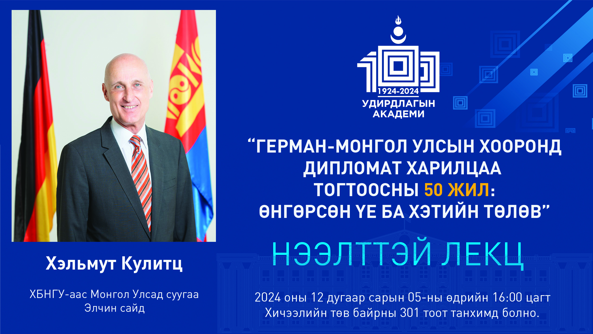Нээлттэй лекцийн зочноор Холбооны Бүгд Найрамдах Герман Улсаас Монгол Улсад суугаа Элчин сайд Хэльмут Кулитц уригдаж "Герман-Монгол Улсын хооронд дипломат харилцаа тогтоосны 50 жил: ӨНГӨРСӨН ҮЕ БА ХЭТИЙН ТӨЛӨВ” сэдвээр лекц уншив