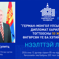 Нээлттэй лекцийн зочноор Холбооны Бүгд Найрамдах Герман Улсаас Монгол Улсад суугаа Элчин сайд Хэльмут Кулитц уригдаж "Герман-Монгол Улсын хооронд дипломат харилцаа тогтоосны 50 жил: ӨНГӨРСӨН ҮЕ БА ХЭТИЙН ТӨЛӨВ” сэдвээр лекц уншив. Лекц үнэ төлбөргүй, олон нийтэд нээлттэй зохион байгуулагддаг.