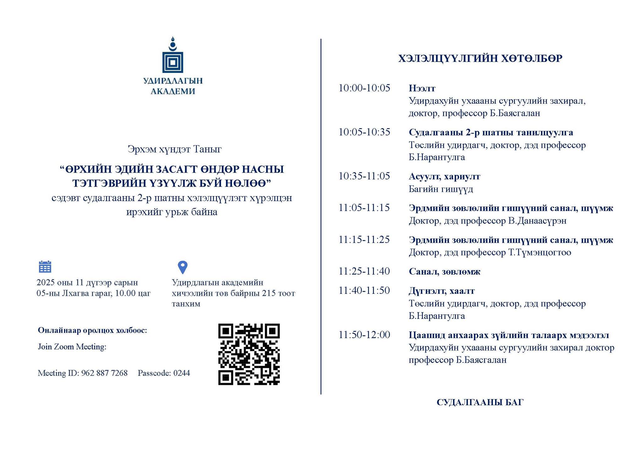 Удирдлагын академиас 2025 онд хэрэгжүүлж буй “Өрхийн эдийн засагт өндөр насны тэтгэврийн үзүүлж буй нөлөө” сэдэвт захиалгат судалгааны үр дүнгийн хэлэлцүүлэг 11 дүгээр сарын 05-ны өдөр боллоо. Энэхүү судалгааг Удирдлагын академийн Улсын салбарын удирдлагын тэнхимийн эрхлэгч, дэд профессор Б.Нарантулга, тэнхимийн багш дэд профессор Ч.Эрдэнэчимэг, докторант Л.Ариунболд, ажилтан Б.Батчимэг, Эдийн засаг, санхүүгийн удирдлагын тэнхимийн ахлах багш Б.Ганзориг, Эрх зүйн тэнхимийн ахлах багш С.Ганцэцэг, НДЕГ-ын мэргэжилтэн Б.Энхболор нарын бүрэлдэхүүнтэй баг гүйцэтгэж байна.