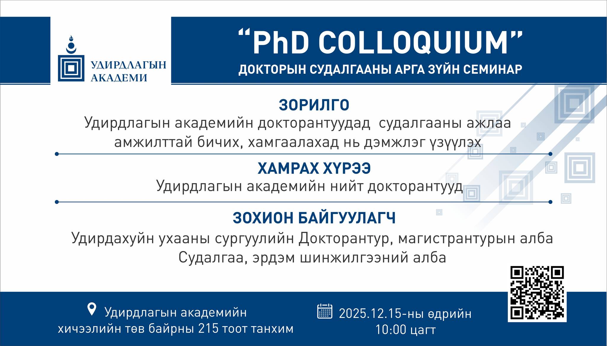 - Удирдлагын академийн докторантуудад судалгааны ажлаа амжилттай бичих, хамгаалахад нь дэмжлэг үзүүлэх зорилготой “PhD COLLOQUIUM” судалгааны арга зүйн семинар боллоо