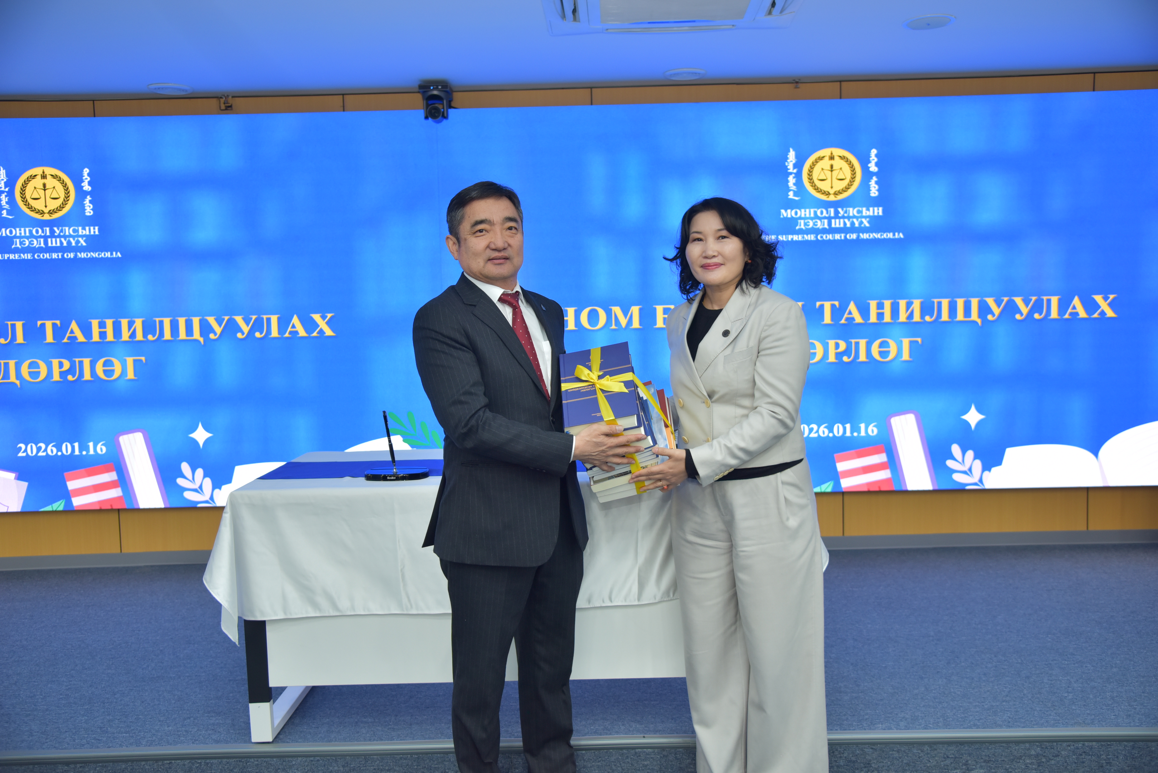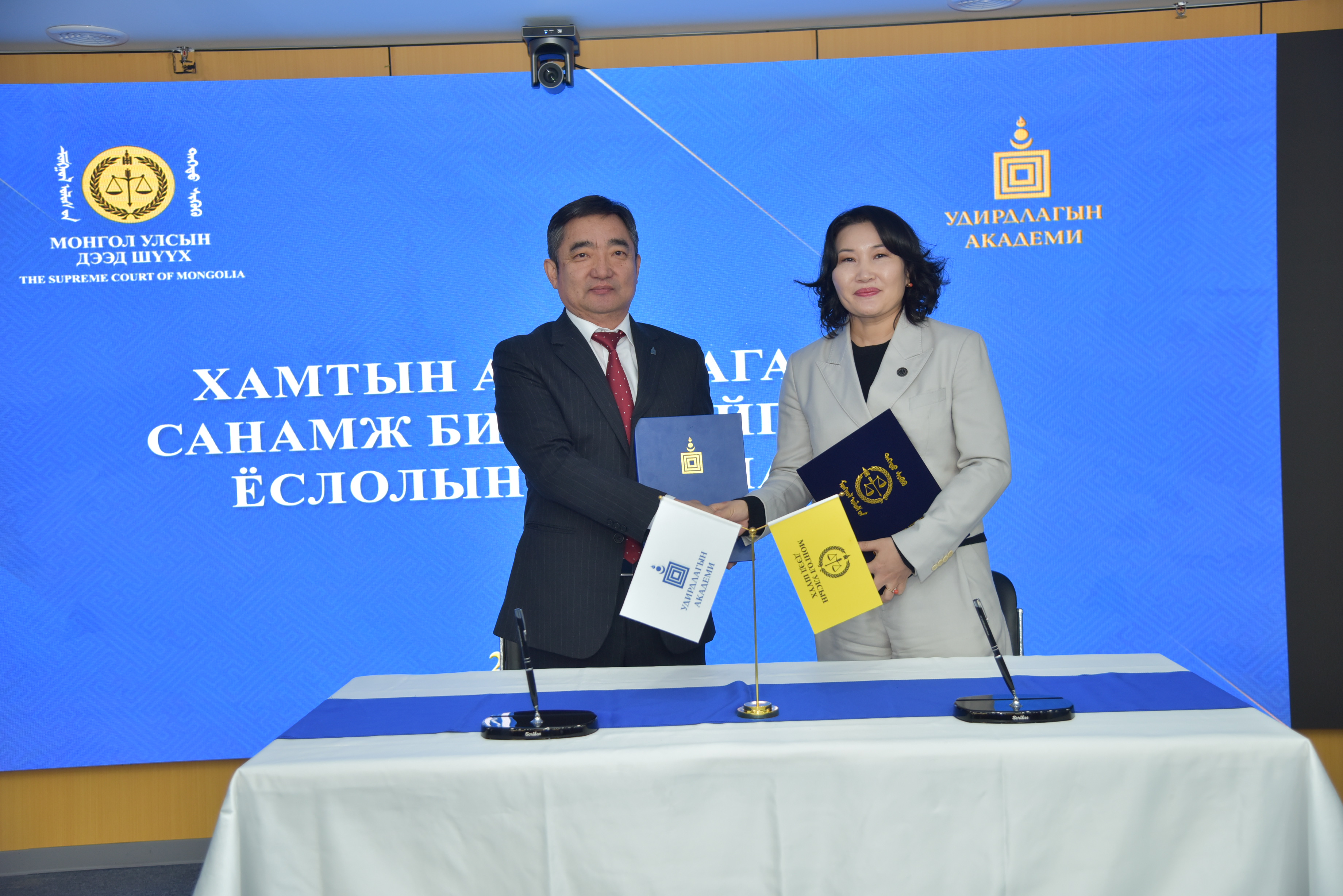 Монгол Улсын дээд шүүхийн Тамгын газраас 2026 оны 01 дүгээр сарын 16-ны өдөр зохион байгуулсан ном, бүтээл танилцуулах, солилцох, судалгааны санг баяжуулах, номын сангуудтай туршлага солилцох, хамтран ажиллах зорилготой номын өдөрлөгийн үеэр Удирдлагын академийн захирал, доктор, профессор Д.Байгал, Монгол Улсын дээд шүүхийн Тамгын газрын дарга С.Заяадэлгэр нар Хамтын ажиллагааны санамж бичиг байгуулж гарын үсэг зурав.