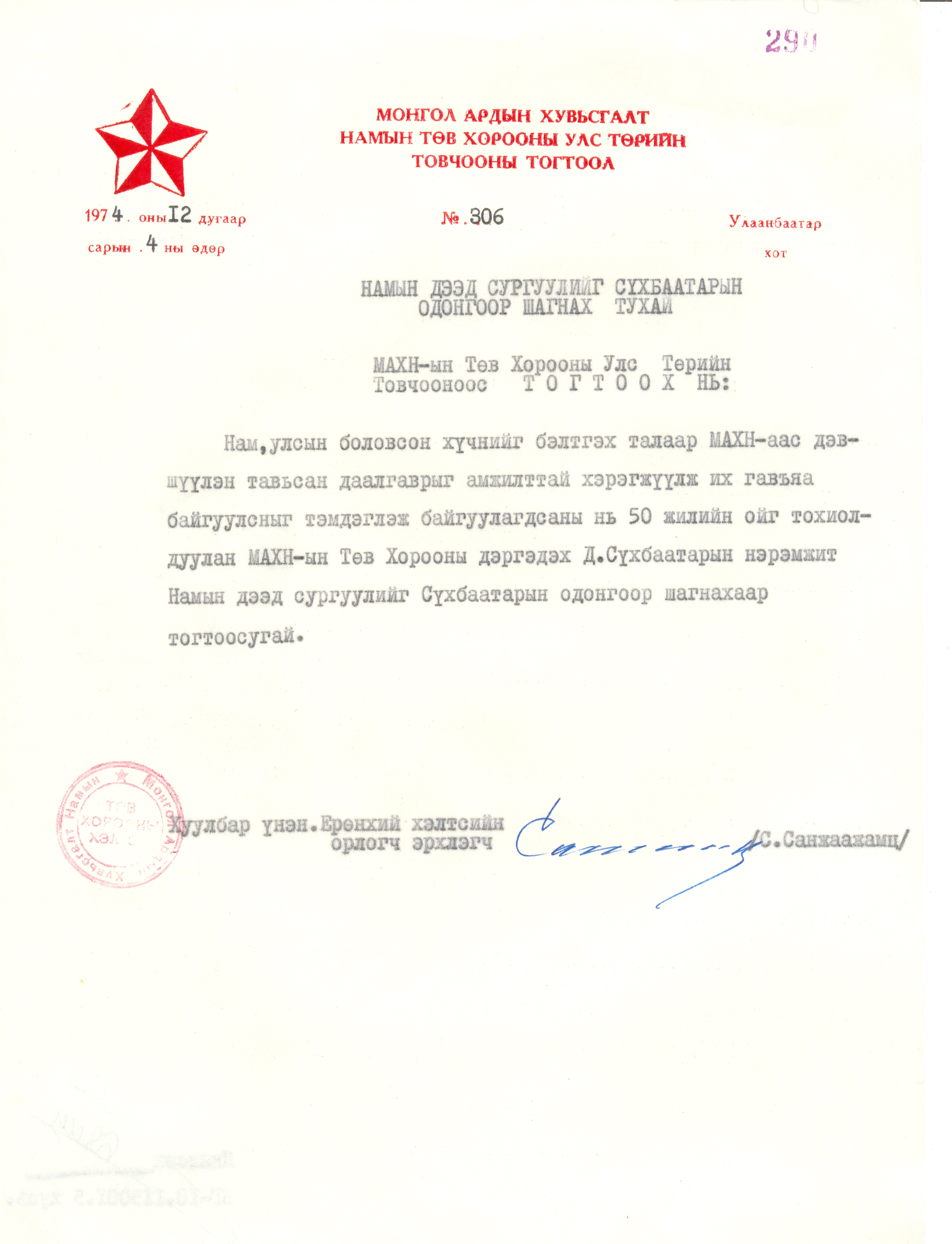 - Сүхбаатарын одонгоор шагнах тухай МАХН-ын Төв хорооны Улс төрийн товчооноос тогтоох нь: